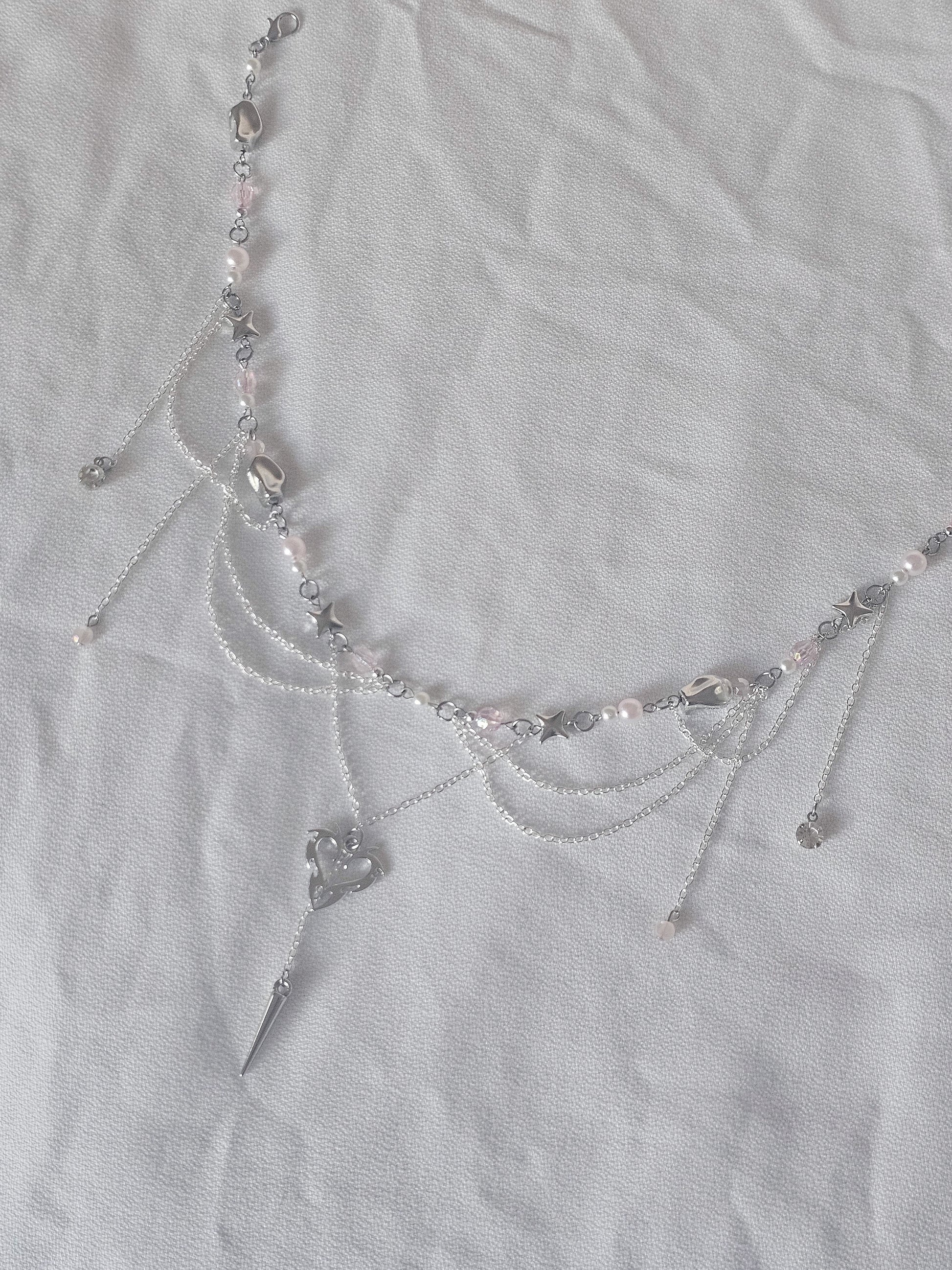 detailed chainwork and cybersigilism elements come together with pastel pinks and pearls to create a heartbreakingly beautiful medley of both soft and sharp aesthetics.